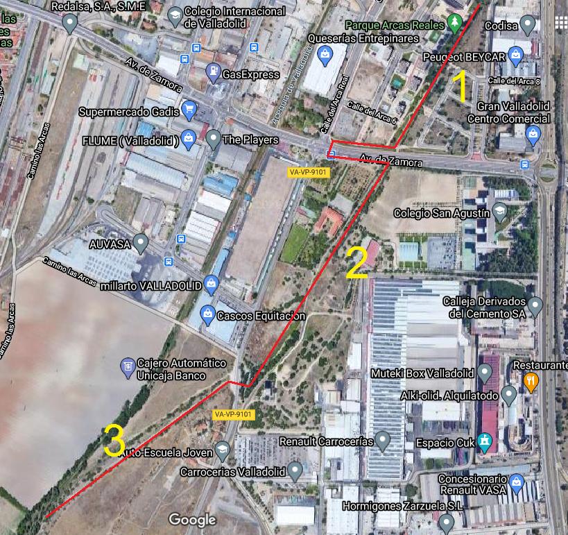 El primer tramo comenzaría al lado de la Avenida Madrid, por detrás de unas naves industriales en la Calle del Arca 2. Ahí comienza un parque conocido como Parque de las Arcas Reales, en el que podemos ver las Arcas de la 9 a la 6 ( cada Arca está numerada, con su número encima de la puerta).