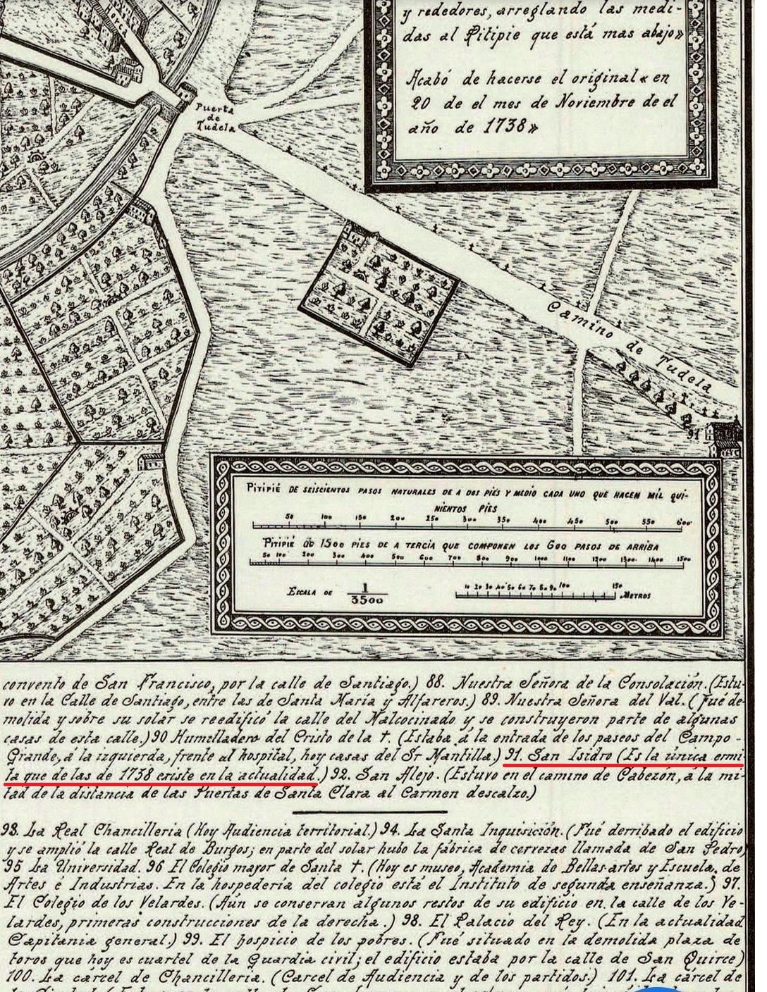 Podemos apreciar en este plano de la ciudad de Valladolid, copia realizada en 1900 del mapa que realizó Bentura Seco en 1738, la posición de la ermita de San Isidro. En esta copia de 1900 se han añadido anotaciones sobre los lugares y monumentos de la ciudad, indicando sobre la ermita de San Isidro que es la única que queda de las existentes en 1738.
